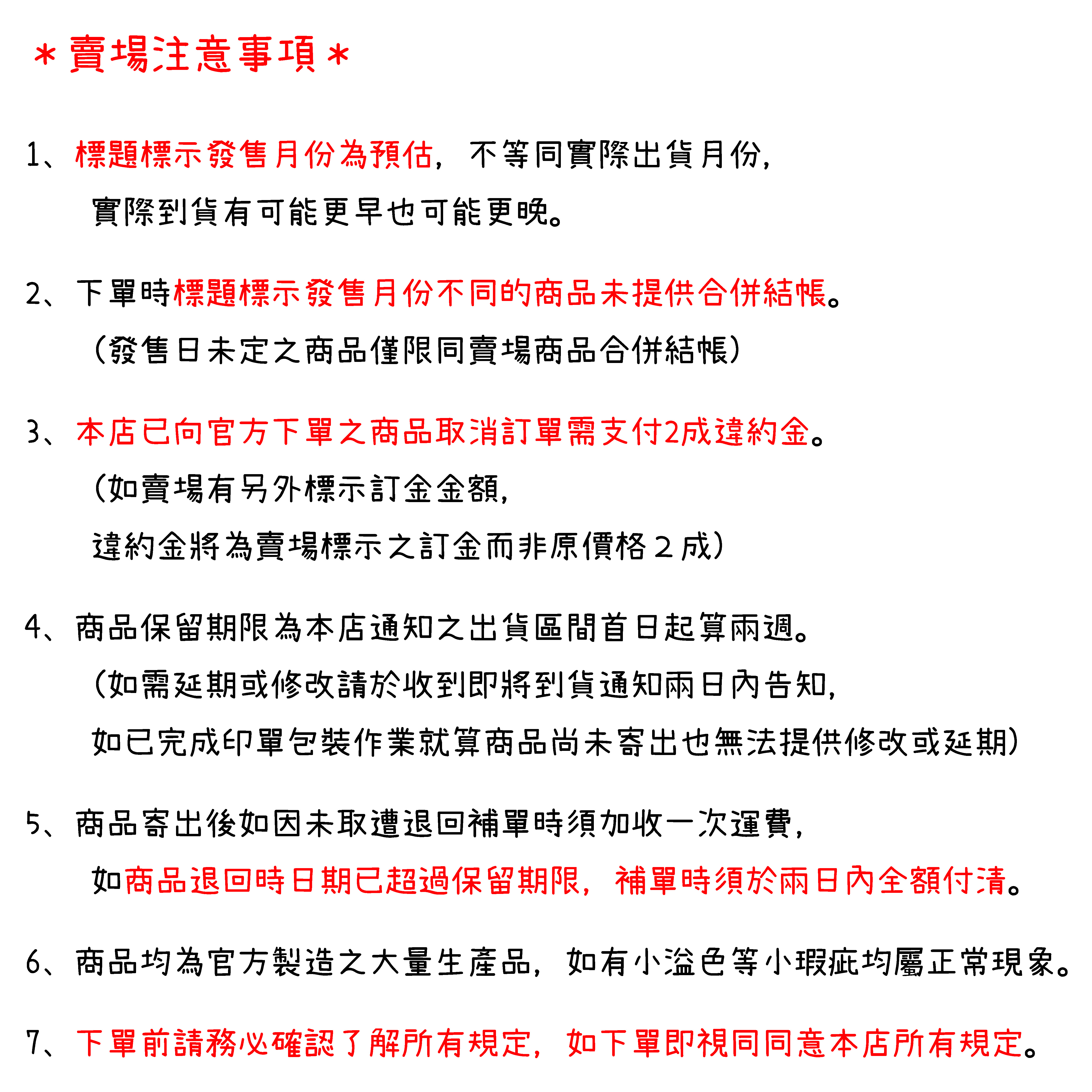 (2)、公仔類商品延期機率高且廠商通常不會通知,故如有延期本店不會另行通知,如果想確認最新預計出貨月份可直接向本店詢問。